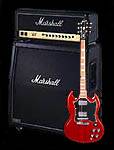 Gibson SG and uses a Super Lead Marshall Head and double stack.